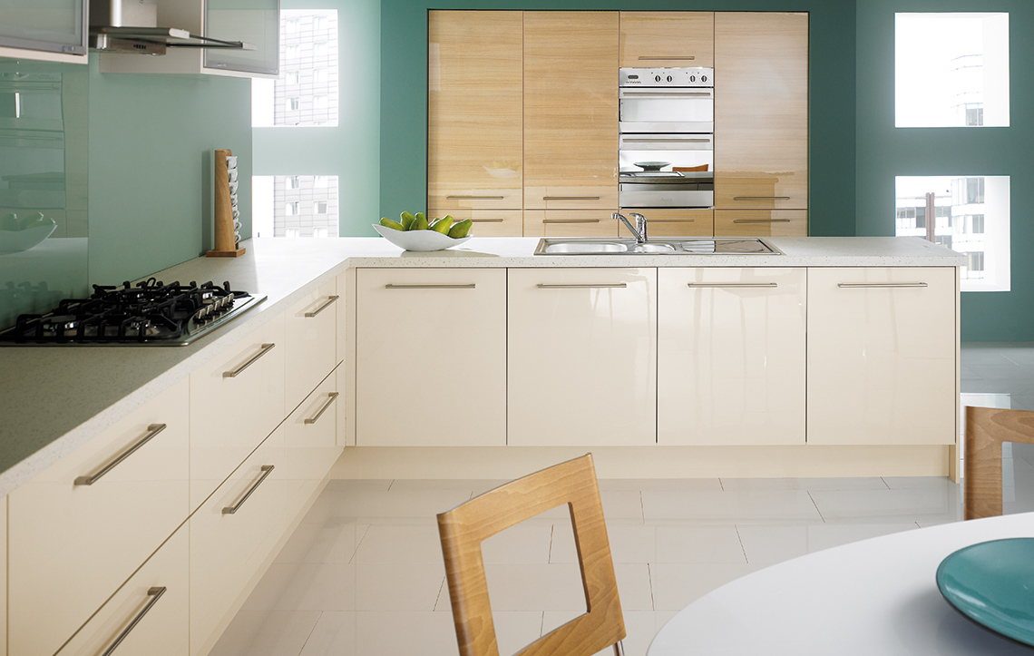 Here high gloss Cream and Oak are cleverly used together to give a contrasting, contradictory appearance with both contemporary and traditional aspects.